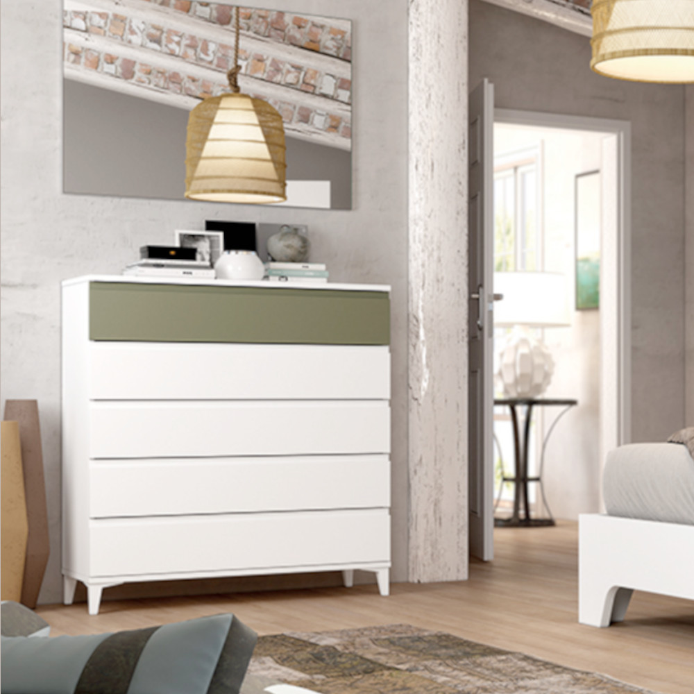 - Cómoda de 5 cajones sin titrador modelo Jota en color blanco y verde oliva. Pata piramidal en color blanco (opcional).