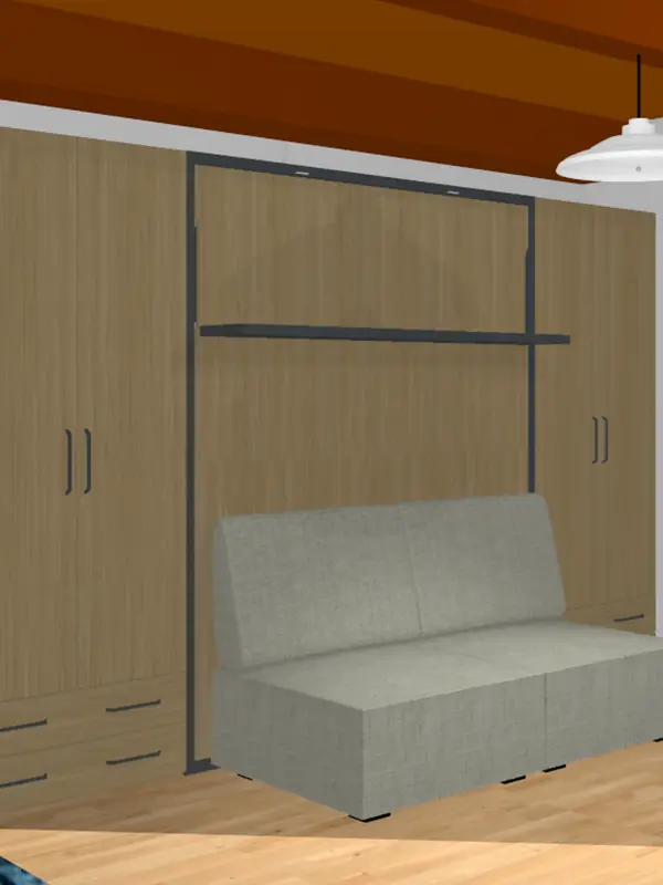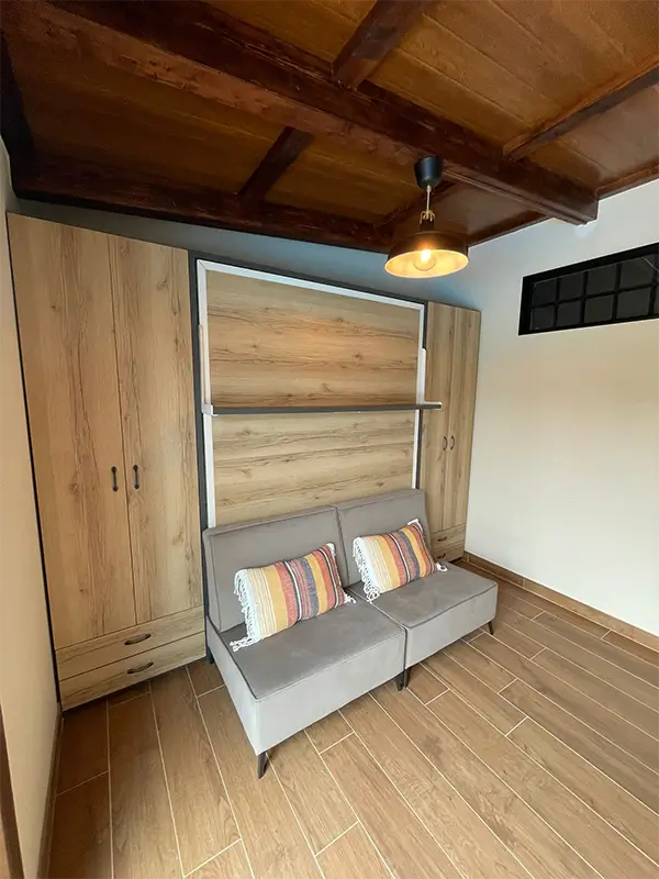 Se instaló una cama abatible integrada con sofá y armario, una solución ideal para transformar un mismo espacio en dormitorio, salón o zona de invitados. Los materiales en acabado madera y los textiles en tonos cálidos respetan el estilo rústico de la vivienda, mientras que el diseño limpio y actual del mueble aporta equilibrio y funcionalidad.